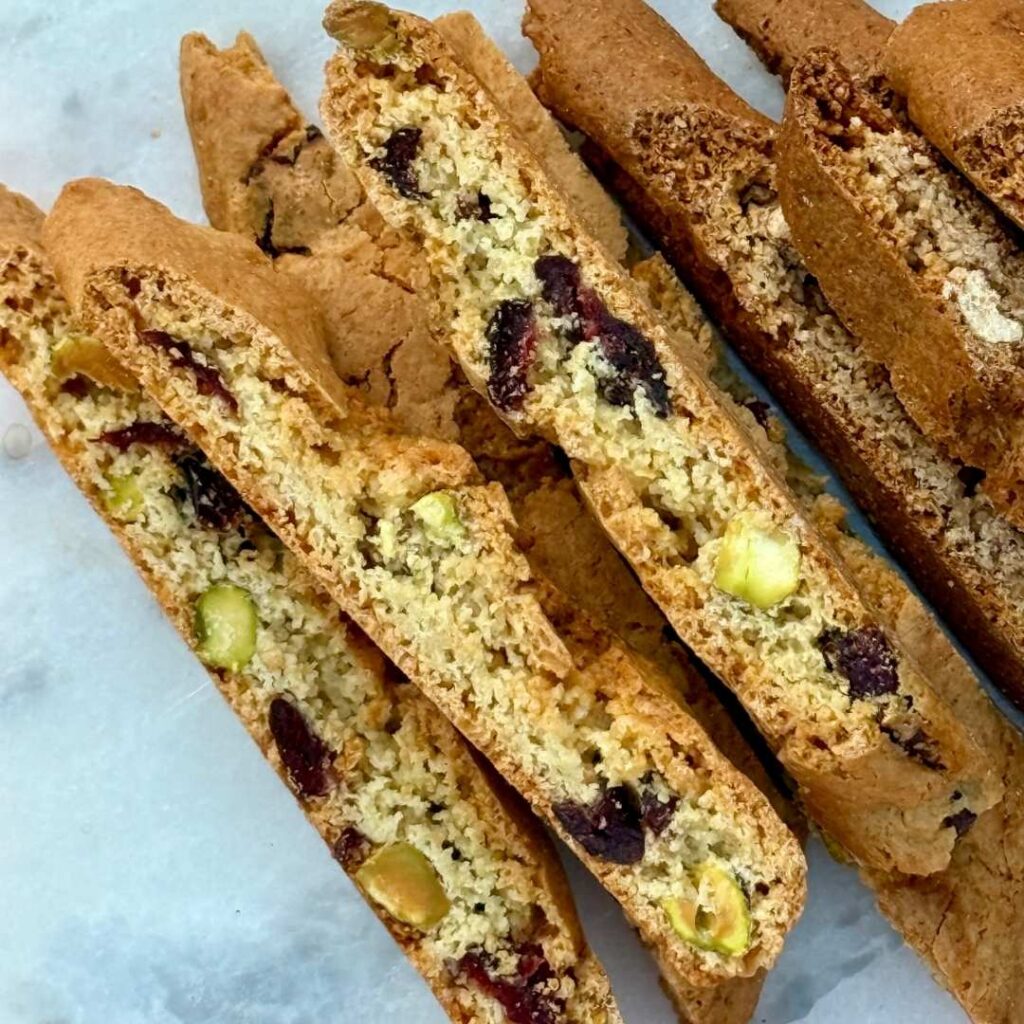 Great biscotti should have a crisp snap, not a rock-hard bite. Ours are baked twice for perfect texture, using whole almonds, whole pistachios, Belgian chocolate, pure vanilla, and just a touch of sea salt that brightens each flavor. Curious about portion sizes and calories? Explore our Biscotti Nutrition Guide.